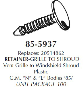 Replaces 20514862. Grille to shroud retainer. Vent grille to windshield shroud. Made of plastic. Used with GM “N” and “L” bodies ’85/. Package of 50.