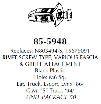 Replaces N803494-S, 15679091. Screw type, various fascia and grille attachment rivet. Made of black plastic. Hole: M6 Sq. Used for Lgt. Truck, Escort, Lynx ’86/, GM “S” Truck ’94/. Package of 50.