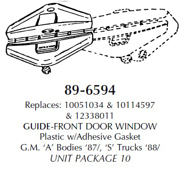 Replaces 10051034, 10114597, and 12338011. Front door window guide. Plastic with adgesive gasket. Used with GM ‘A’ bodies ’87/ and ‘S’ Trucks ’88/. Package of 10.