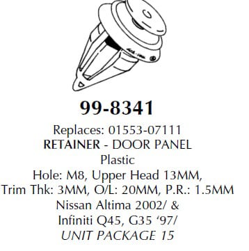 Replaces 01553-07111. Plastic door panel retainer. Hole: M8, upper head: 13MM, trim thk: 3MM, O/L: 20MM, PR: 1.5MM. Use with Nissan Altima 2002/ and Infiniti Q45, G35 ’97/. Package of 25.