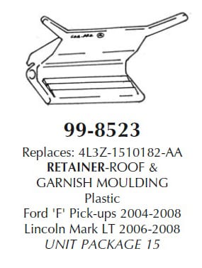 Replaces 4L3Z-1510182-AA. Roof and garnish moulding retainer. Made of plastic. Use with Ford ‘F’ pick-ups 2004-2008 and Lincoln Mark LT 2006-2008. Package of 15.